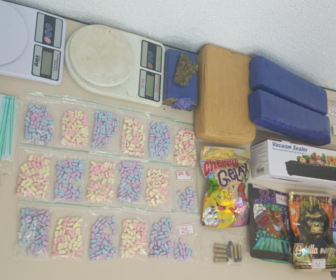 No interior de um móvel e na geladeira, os militares localizaram e apreenderam 836 comprimidos de ecstasy, aproximadamente 3,2 quilos de maconha e 18 gramas de haxixe. Além dos entorpecentes, foram encontradas sete munições de revólver (calibre .38), duas balanças de precisão e um equipamento utilizado para embalar as drogas a vácuo.