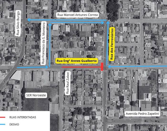 Sentido Centro para Oficinas: o trajeto alternativo indicado é pelas ruas dos Ferroviários e Manoel Antunes Corrêa.