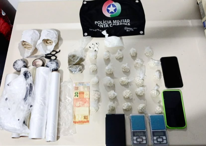 Os militares localizaram no interior de uma casa 174,6 gramas de crack, 68,9 gramas de cocaína e 37,6 gramas de maconha. Além das drogas, foram apreendidas três balanças de precisão, dois celulares e dinheiro.