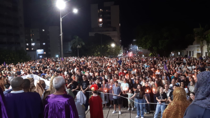 Foto: Gabriel Rodrigues/Rádio Tubá A Procissão Luminosa do Senhor Morto, na noite desta Sexta-Feira Santa (3), reuniu mais de 20 mil fiéis na Catedral Diocesana de Tubarão.